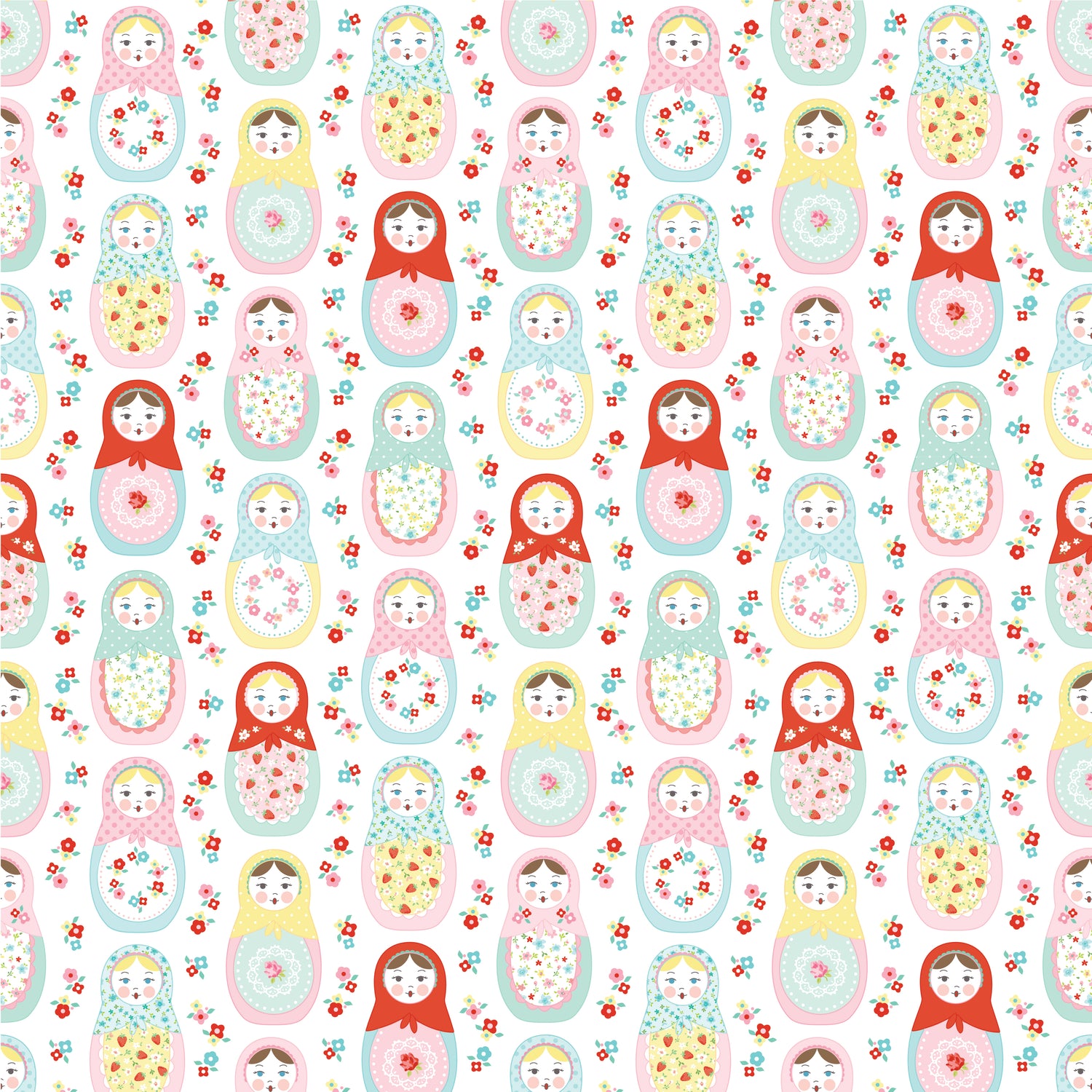 A sweet fabric collection with a vintage vibe. The designs including a matryoshka doll, market day buntings, mini strawberries, teeny tiny flowers in an all over toss, on doilies and in a trellis.