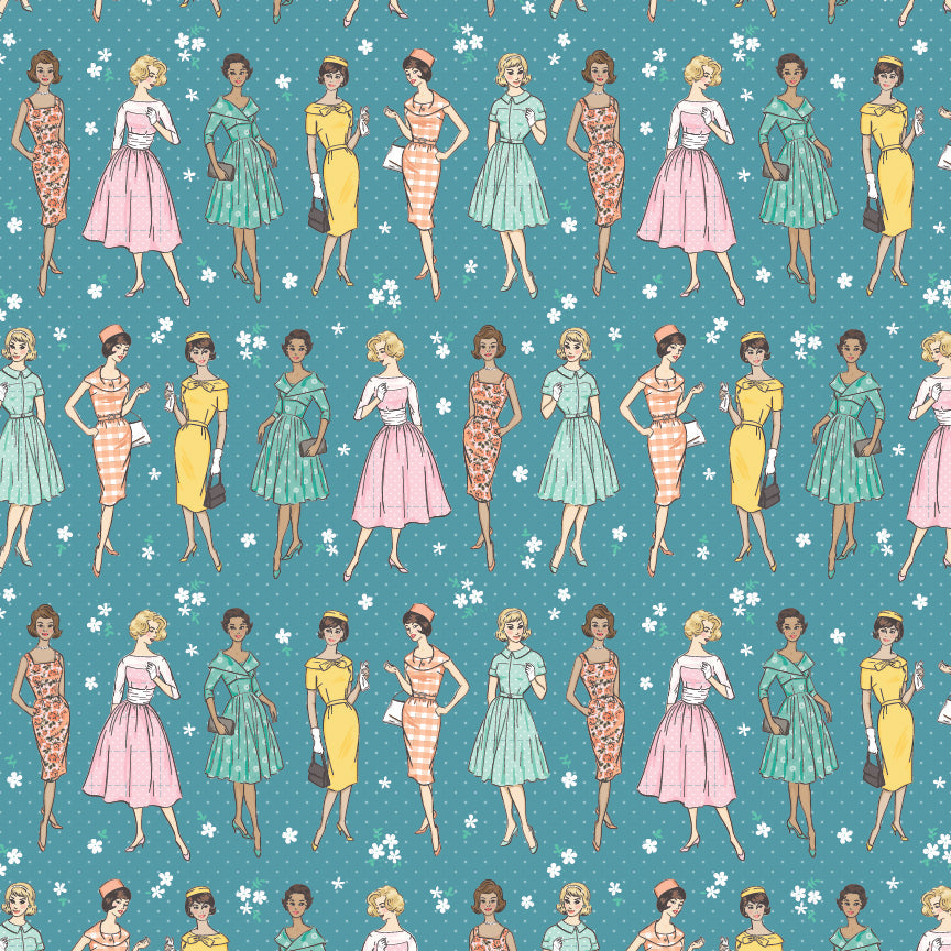 This beautiful collection has mixed yellows, mints, teals and all shades of pinks to create a colorful color palette. The fabric collection includes 1950’s dresses on lovely ladies, roses, ginghams, tiny tossed roses, receipts for the shopping day and all over flower dots.