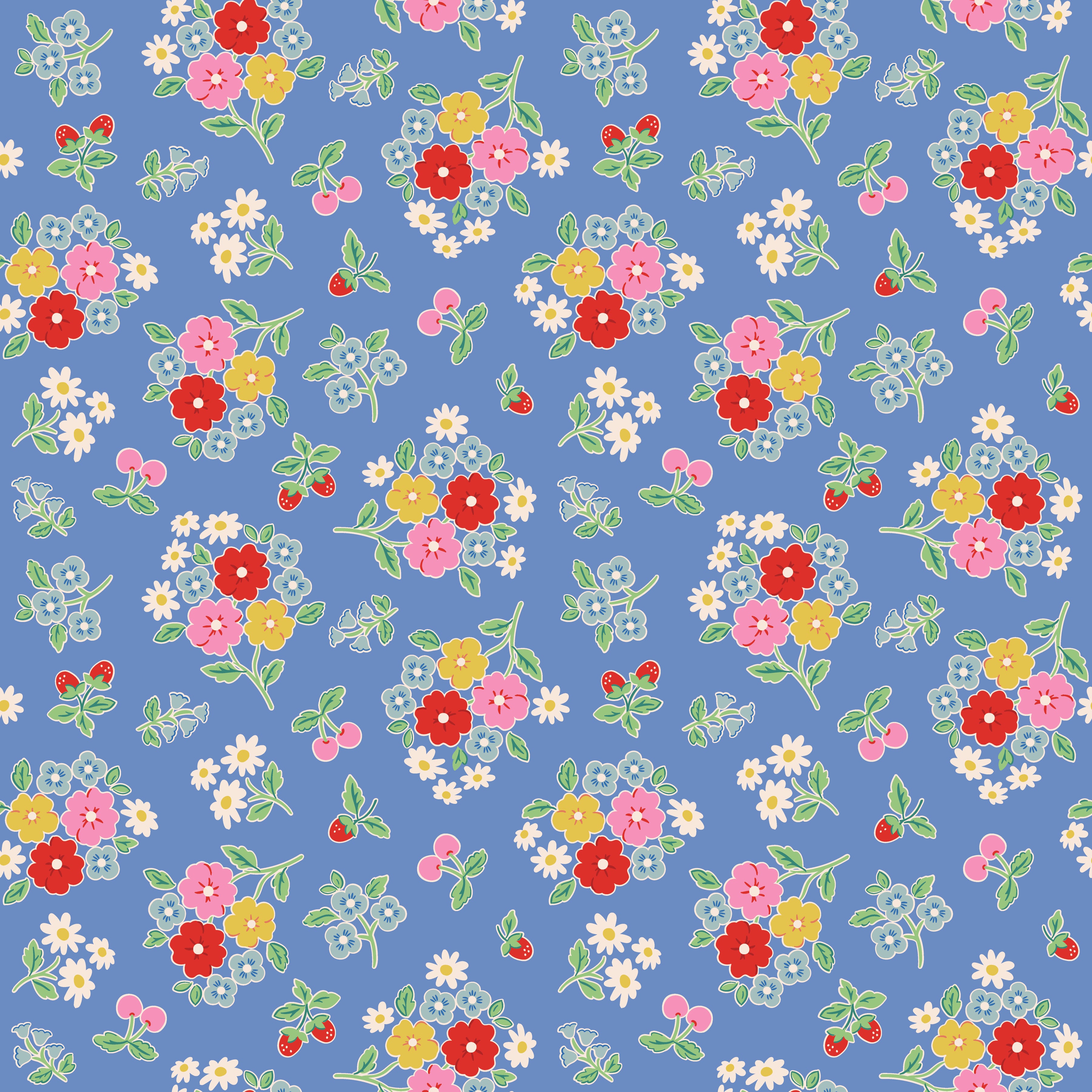 The Bluebells & Buttercups collection by Elea Lutz is bursting with playful designs of flowers, bows, strawberries, cherries, and sweet little bluebirds, each motif sprinkles charm as it dances across periwinkle, pink, mint, sky, red, and white backgrounds. The cheerful project panel adds a touch of vintage flair, featuring a happy saying, sweet bluebird blocks, and handmade-style labels. Perfect for quilts, sewing projects, and more, this collection brings joy and a little bit of magic to every stitch.Â