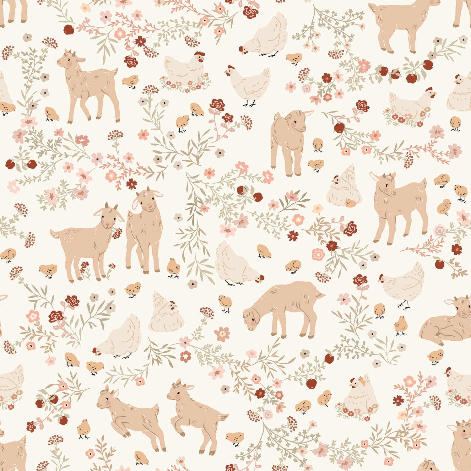 Celebrate the simple joys of country life with orchard fruits, delicate blooms, and playful barnyard friends. Tossed apples and clusters of briar roses mingle with curious chickens, frolicking goats, and tiny meadow sprigs, creating a sweet countryside feel.