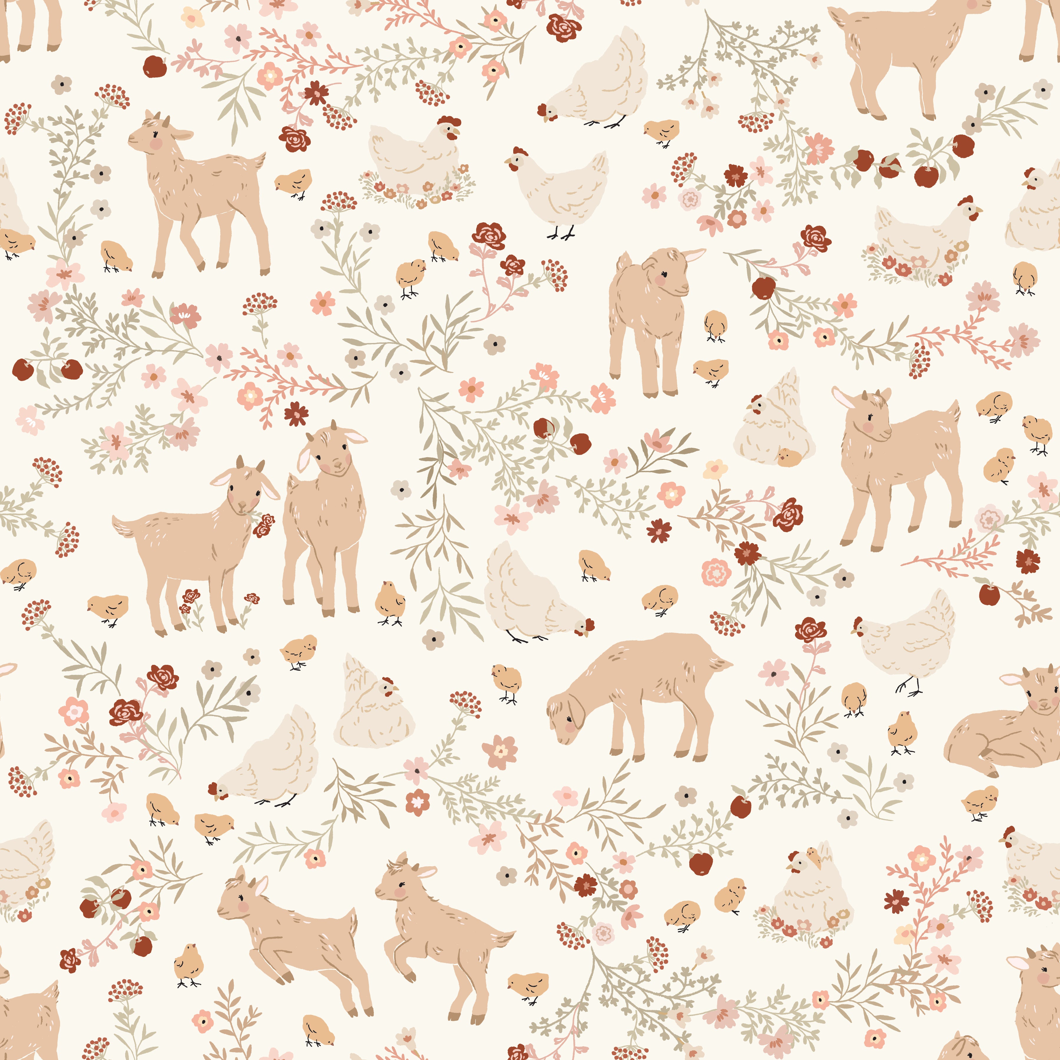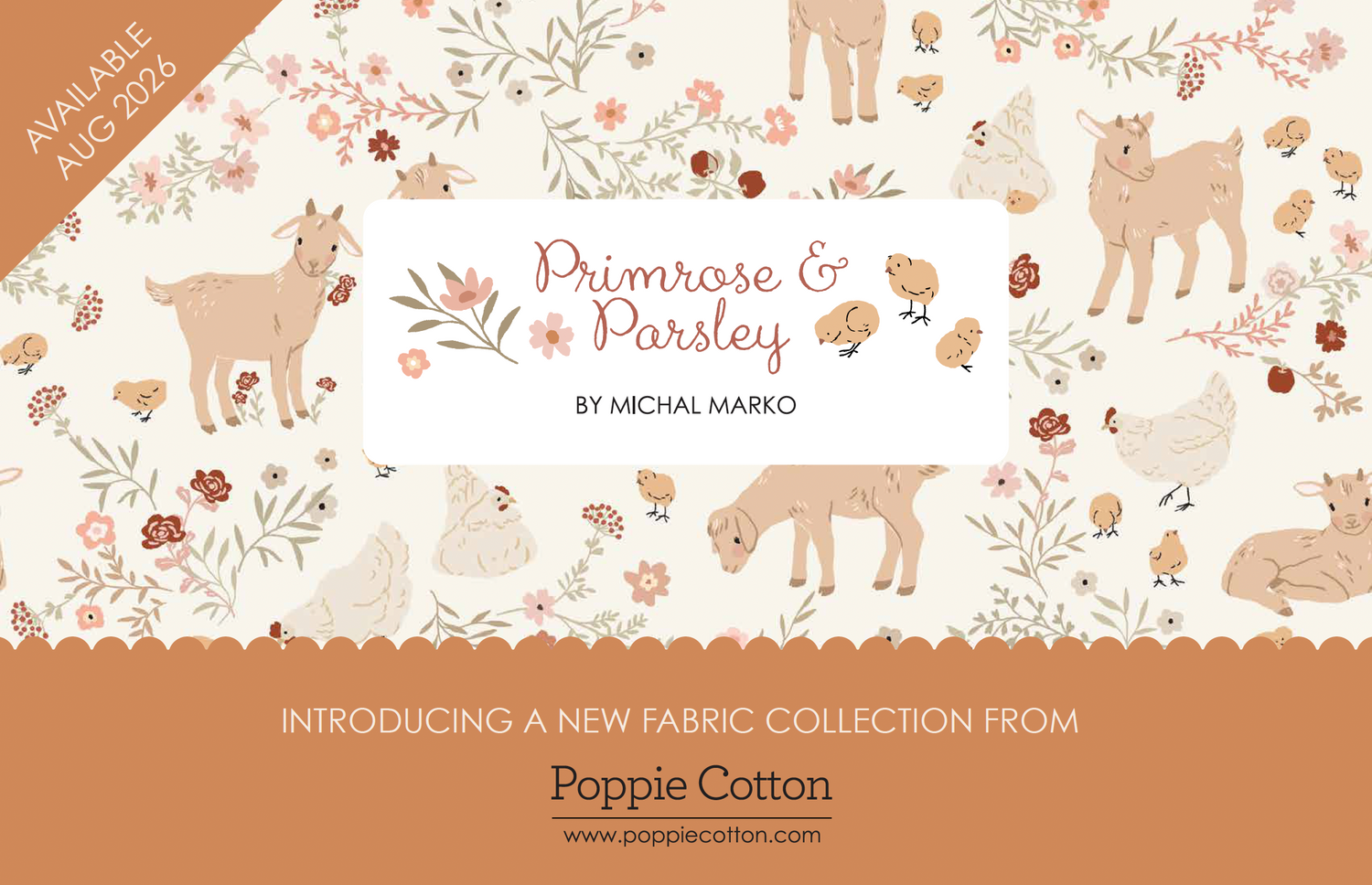 Celebrate the simple joys of country life with the Primrose & Parsley collection. Overflowing with orchard fruits, delicate blooms, and playful barnyard friends, these designs bring a gentle, pastoral charm to quilts, sewing projects, and home décor. Tossed apples and clusters of briar roses mingle with curious chickens, frolicking goats, and tiny meadow sprigs, creating a sweet countryside feel. Soft sage, blush, beige, rose, and natural backgrounds add a cozy touch, perfect setting for evoking the warmth and country charm.