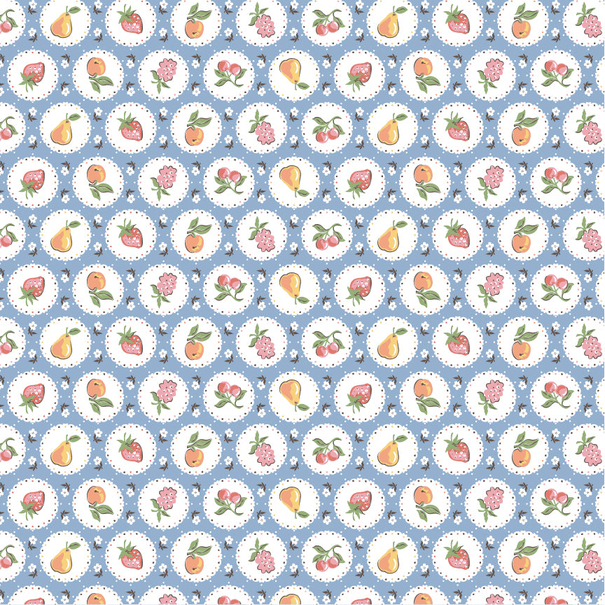 Assorted fresh fruits on delicate white plates tossed with small white flowers on a blue background.