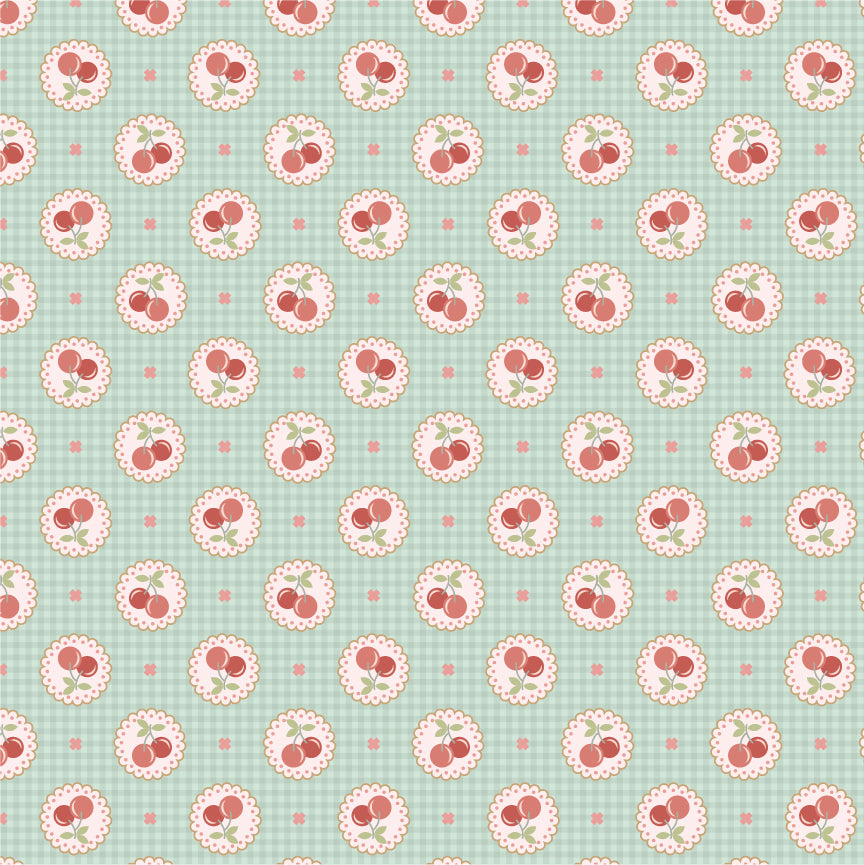 Darling doily-wrapped cherries and X accents on a blue gingham background.