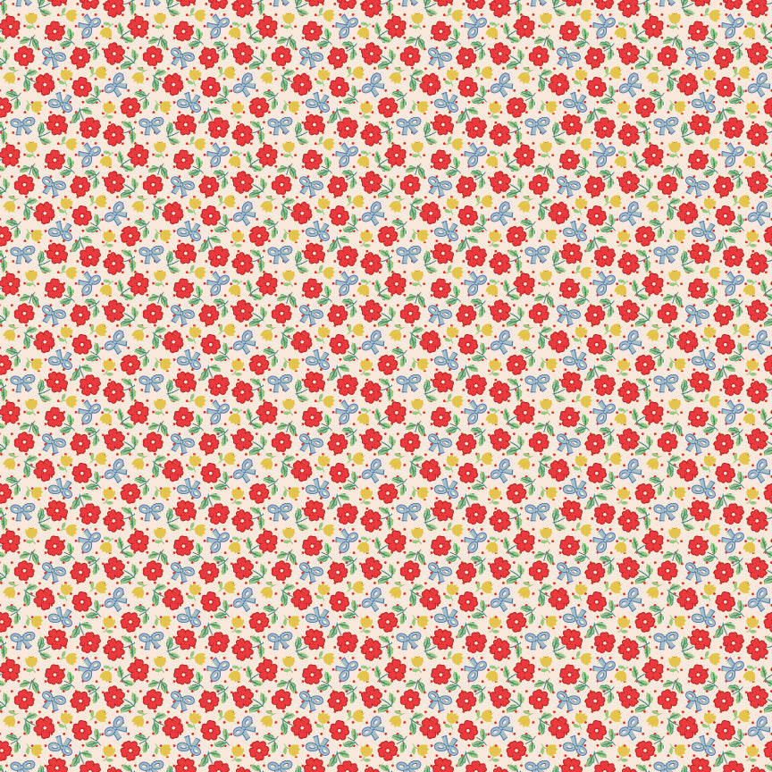 Darling little red stemmed flowers dancing with tulips and sky blue bows on a natural background.