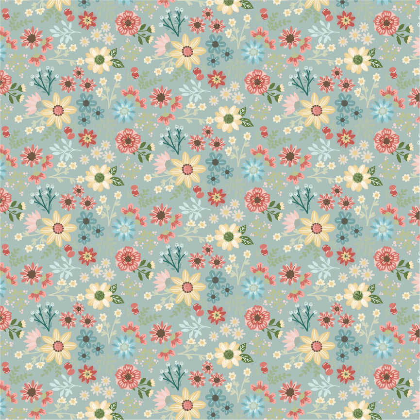 Cheerful flower blooms, leafy bits, and soft sprigs over a blue background.