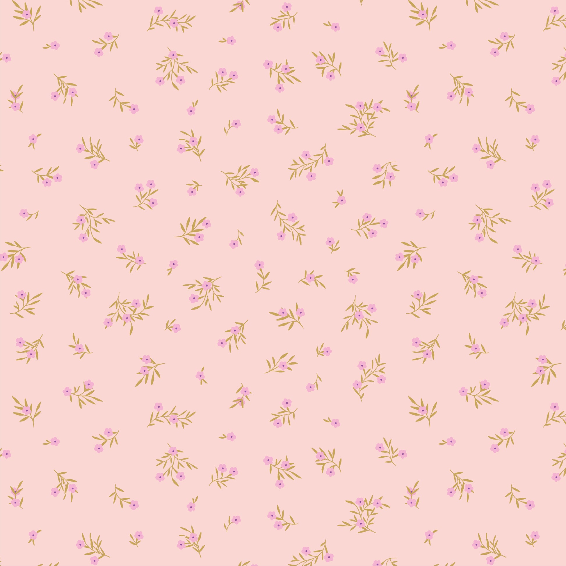 Delicate little sprigs with tiny flowers scattered across a rose background.