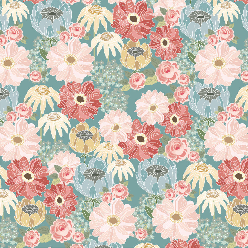 Peonies, roses, and daisies dancing in the moonlight on a blue background.