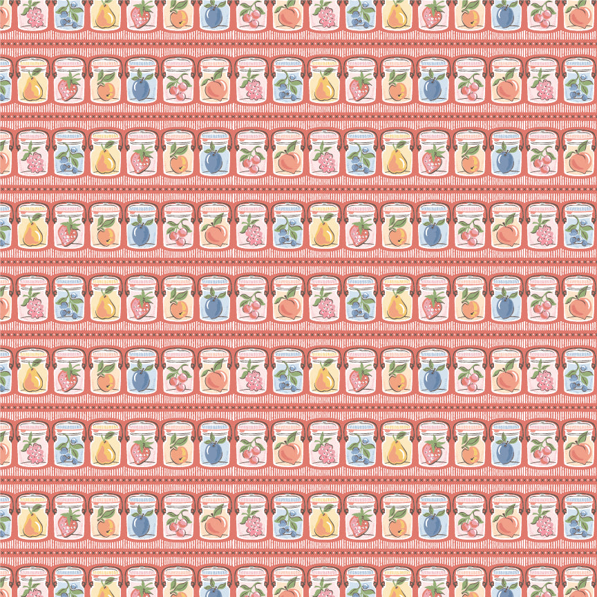 Rows of delicate charming canning jars filled with beautiful fruit, arranged on red shelves accented with delicate white lines.