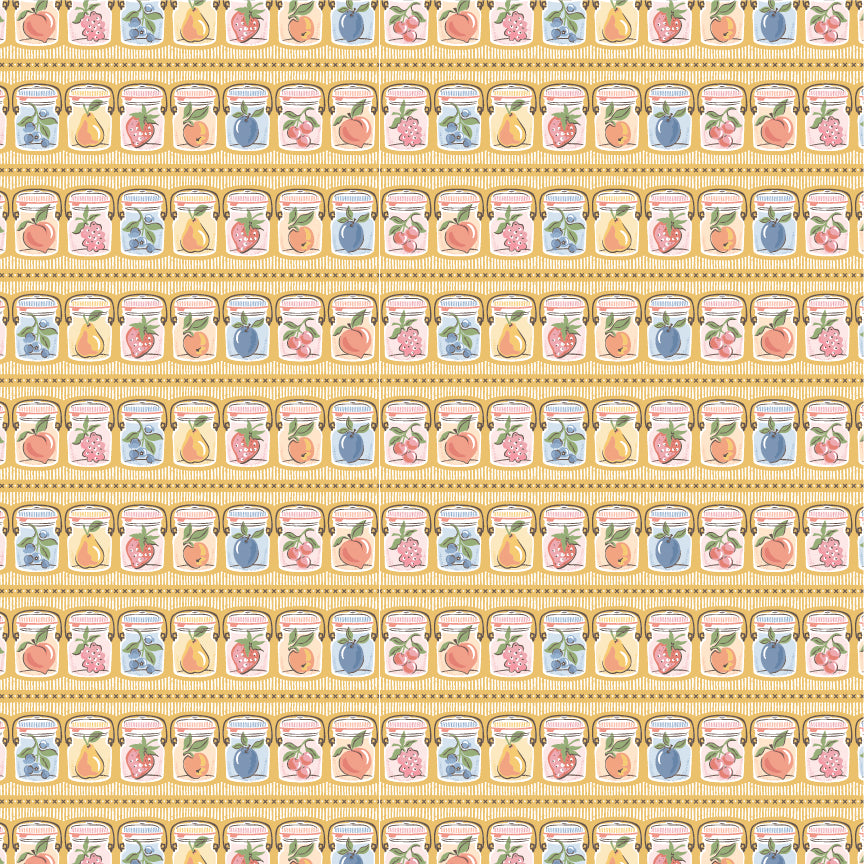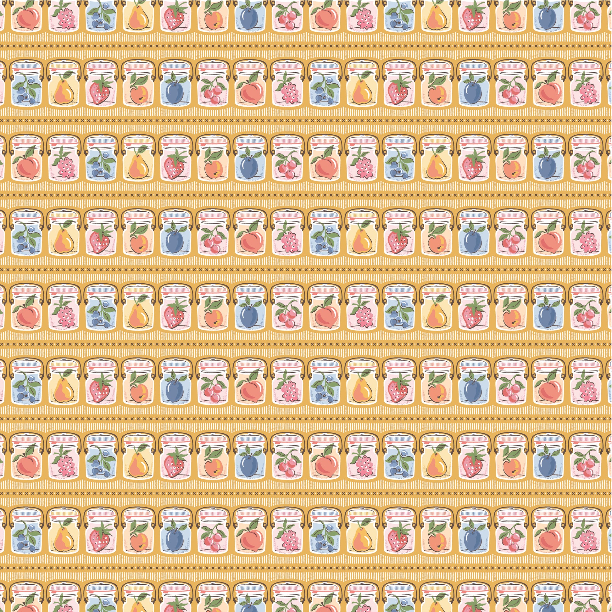 Rows of delicate charming canning jars filled with beautiful fruit, arranged on yellow shelves accented with delicate white lines.